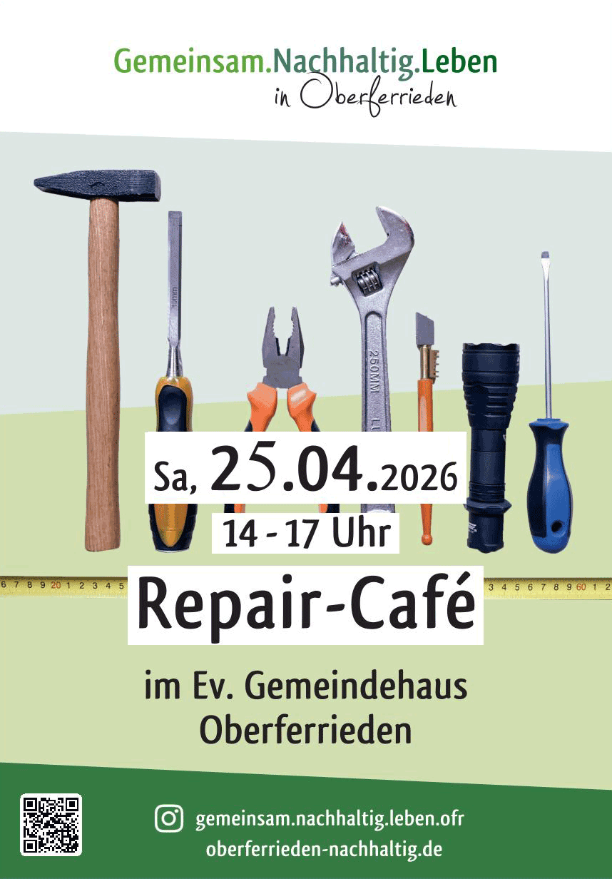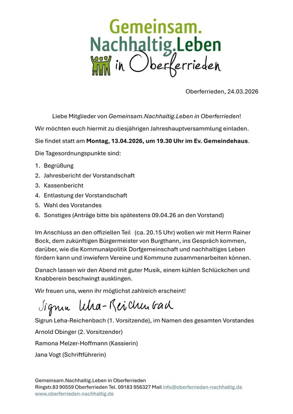 Jahreshauptversammlung Jahreshauptversammlung von Gemeinsam.Nachhaltig.Leben in Oberferrieden e.V. am Montag den 13. April 2026 um 19.30 Uhr im Ev. Gemeindehaus. Neben