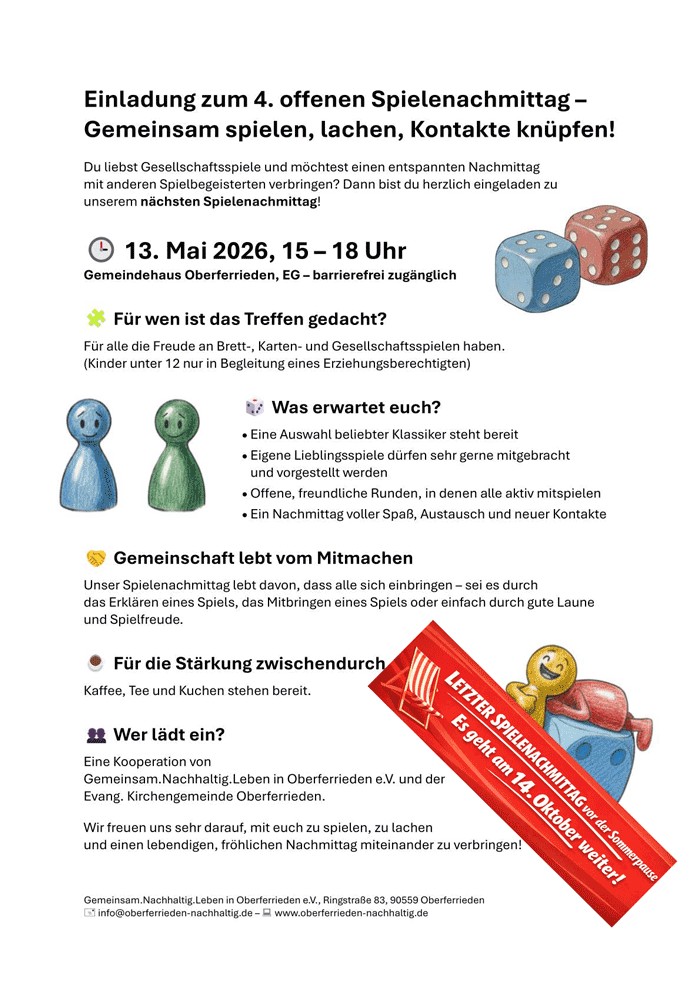 4. Spielenachmittag Auf zur nächsten Spielerunde! Kommt zu unserem nächsten Spielenachmittag. Viel Spaß, unterhaltsame Spiele, Kaffee/Tee und Kuchen erwarten euch.