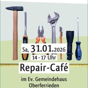 Samstag, 31.01. 14-17 Uhr Zweites Oberferrieder Repair Café Zum zweiten Mal findet das Oberferrieder Repair Café im Gemeindehaus statt. Menschen, die einen defekten Gegenstand haben, können damit einfach vorbeikommen. Gebracht werden können tragbare oder fahrbare Elektrogeräte wie Haartrockner, Staubsauger, Leuchten und (Mobil-)telefone oder Spielsachen. Wer ein Messer hat, das geschliffen werden muss, darf dieses ebenfalls gerne […]